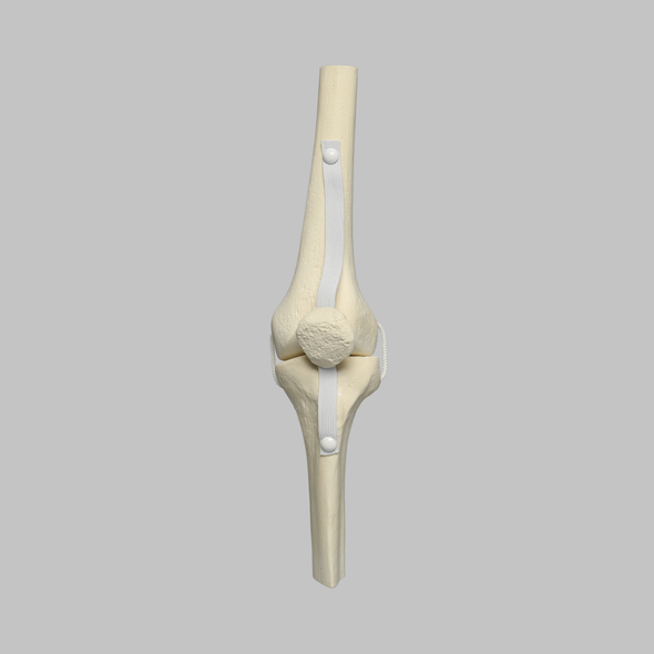 Bone simulation product. Source reference: https://sawbones.com/products/knee-joint-with-patella-and-four-non-stretch-ligaments-solid-foam-medium.html